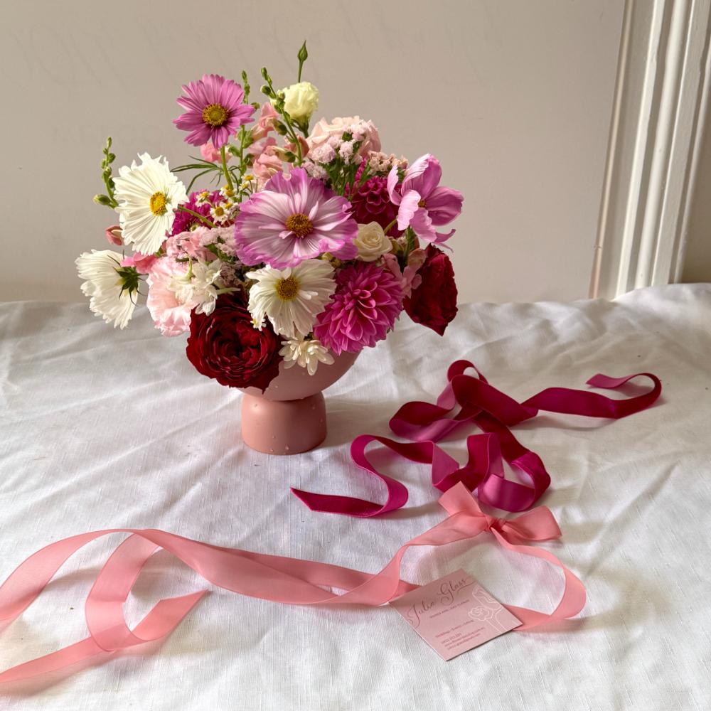 A romantic centerpiece meant to linger. This lush compote bowl arrangement is styled with roses, dahlias, cosmos, and seasonal florals in soft pinks and rich reds. Designed low and abundant, it brings an old-world elegance and a sense of quiet luxury to any Valentine’s setting.