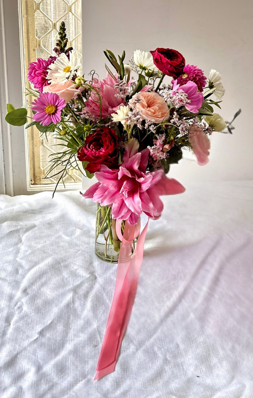 A tender expression of Valentine’s Day love. This seasonal arrangement is designed in shades of pink and red, featuring roses, dahlias, cosmos, and other seasonal blooms. Presented in a clear glass vase and finished with a delicate ribbon, it feels timeless, heartfelt, and full of warmth.